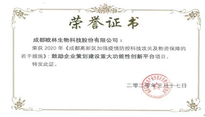 欧林生物疫苗研究院荣获2020年《成都高新区加强疫情防控科技攻关及物资保障的若干措施》:鼓励企业策划建设重大功能性创新平台项目