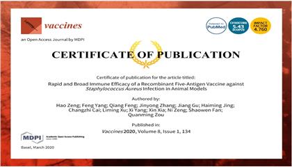 2020年3月18日,主要由樊绍文董事长带领的欧林生物科研团队及陆军军医大学邹全明教授带领的专家团队完成的论文《重组五价金黄色葡萄球菌疫苗在动物模型中的快速、广泛免疫效果研究》在多学科数字出版机构(MDPI)的《疫苗》(vaccines)期刊成功发表。