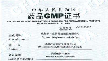 2017年1月16日,欧林生物传来喜讯,经国家食品药品监督管理总局食品药品审核查验中心专家组的严格检查,国家食品药品监督管理总局食品药品审核查验中心综合评定认为:欧林生物符合药品GMP认证检查评定标准,吸附破伤风疫苗获准国家《药品GMP证书》。